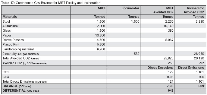 The table above shows the net balance of greenhouse gas emissions for the MBT facility and an incinerator. They show the situation where the avoided electricity source is gas. The result is that for each tonne treated in the MBT facility, savings of the order 940kg per tonne CO2 equivalent can be realised.