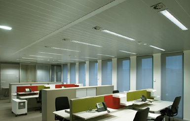 A special grid system is suspended from the soffit of the building using galvanised wires or angle and the metal panels clipped to the system. The panels can be in the shape of a conventional modular 600x600 or 1200x600mm ceiling tile, or in linear strips that are several meters long. The grid components are concealed, but the systems are very adaptable with the void above being easily accessible. Metal pan/linear tray systems can form a monolithic effect giving a clean unbroken appearance with a high level of accessibility.