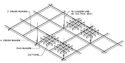 This is the most popular type of suspended ceiling. The tiles can be easily removed in order to provide access to the void. This is the most economical type of ceiling to use in most situations. A metal 'T' grid system is suspended from the soffit of the building using galvanized wires or angle and the panels are then laid into the grid. Both panels and grid are available in various colours and styles.